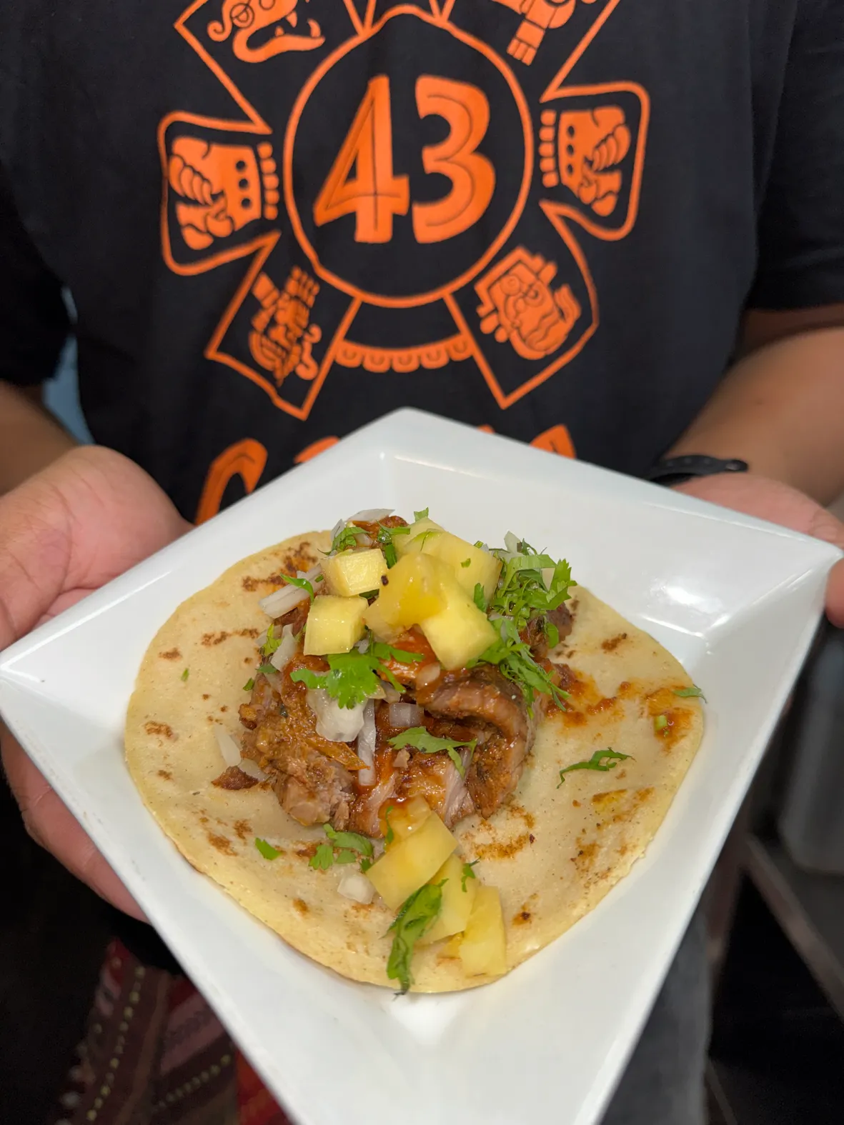 Achiote Marinated Pork shoulder with grilled pineapple, cilantro, & onions.