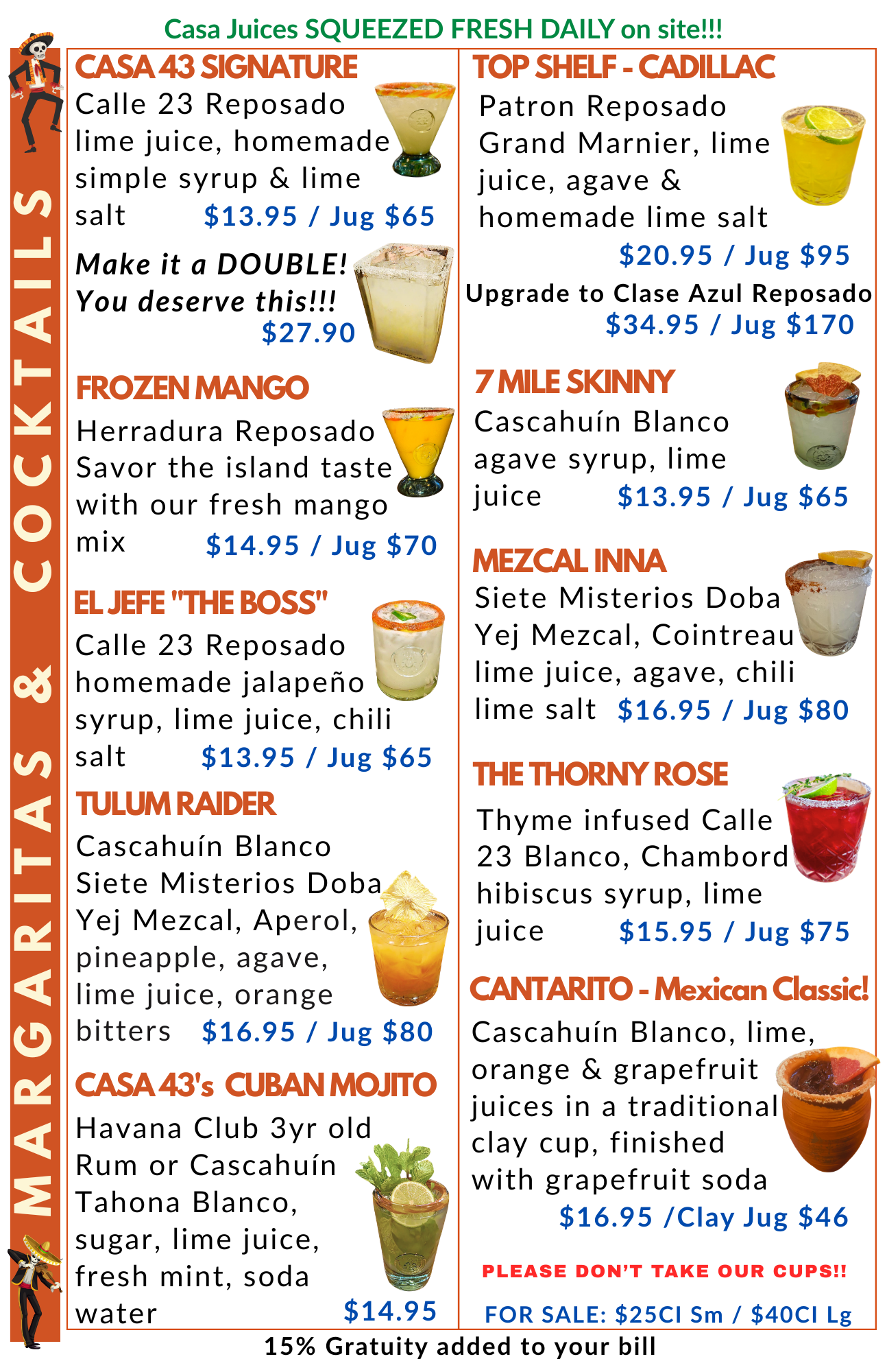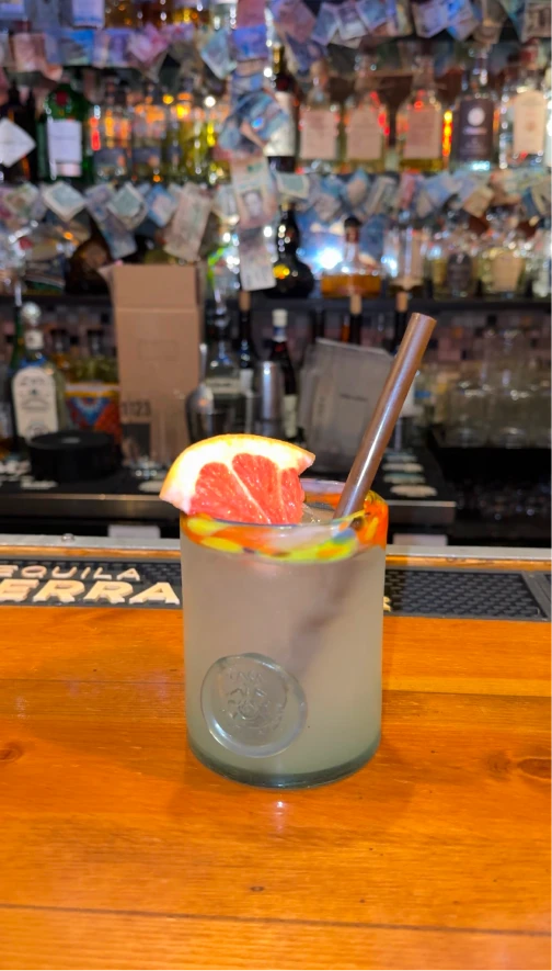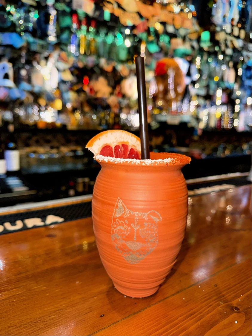 Cascahuín Blanco Tequila, lime, orange and grapefruit juices in a traditional clay cup, a pinch of salt & tajin, finished with grapefruit soda