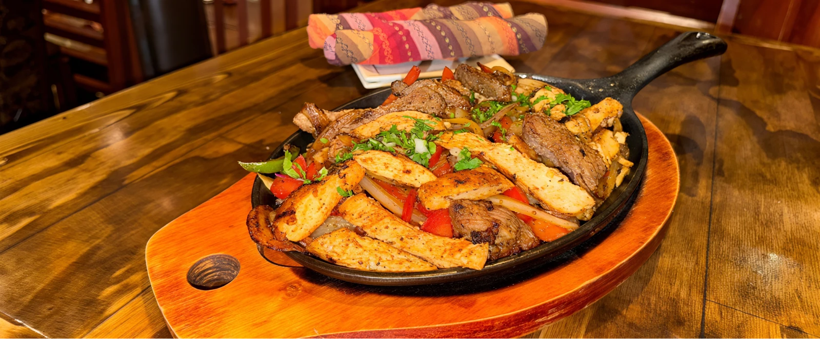 Your choice of protein with red and green peppers & onions. Served with 6 flour tortillas, pepper jack cheese, pico de gallo, guacamole, & sour cream.