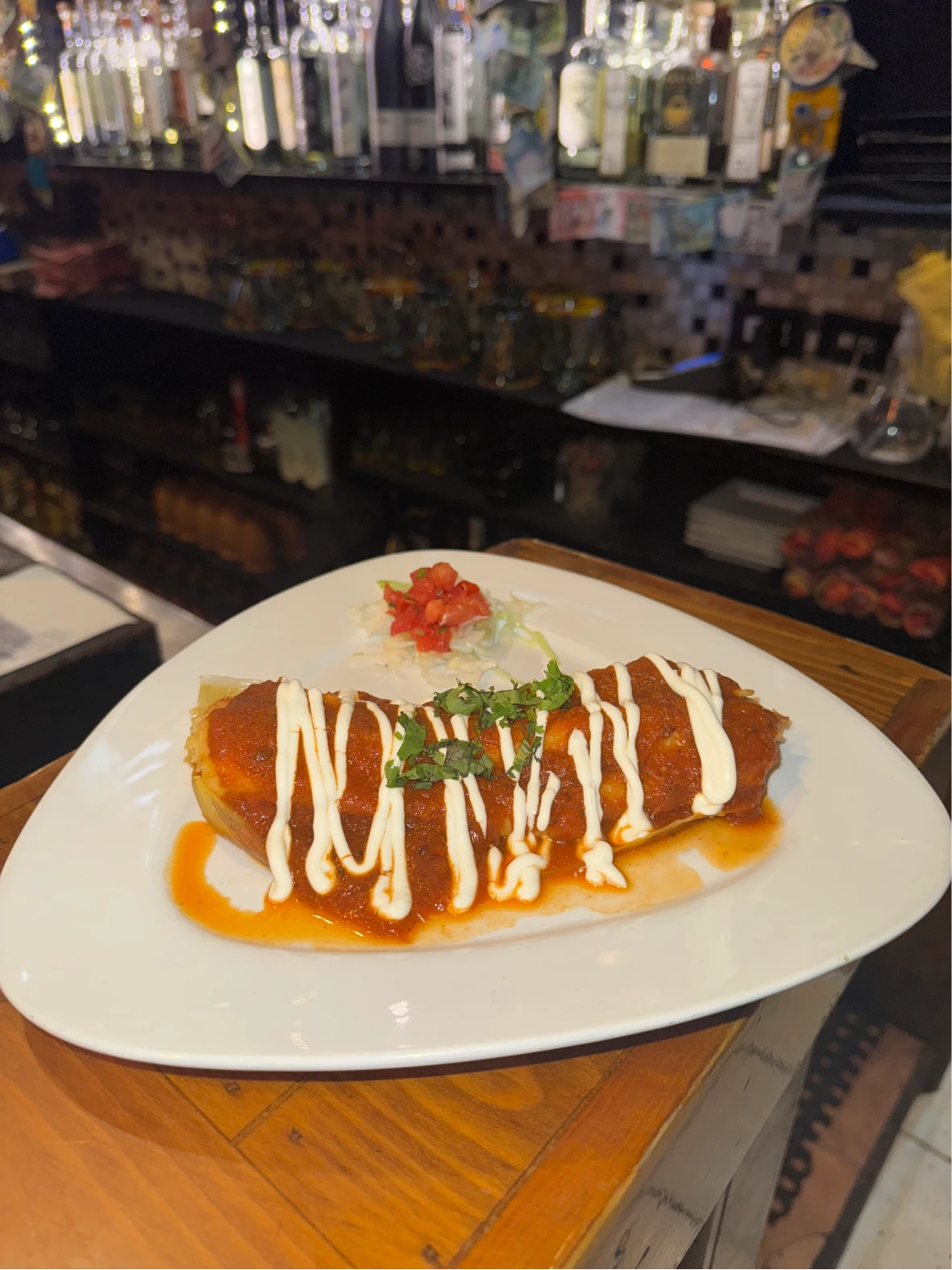 Homemade Corn Masa stuffed with pork carnitas, adobo, served with ranchero sauce, crema, & pico de gallo.