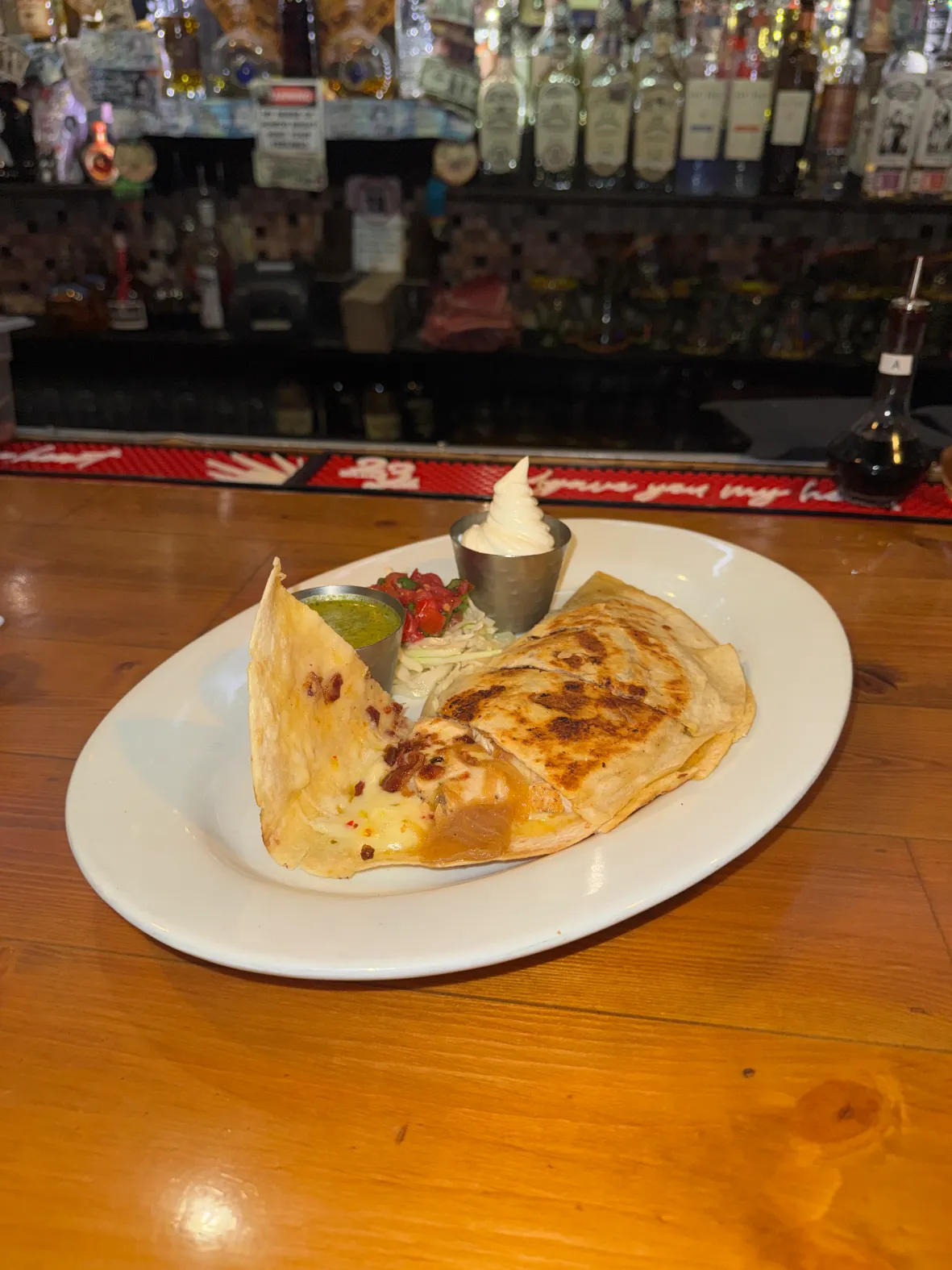 Chicken Quesadilla Post date March 7, 2026 Grilled Chicken with pepperjack cheese, caramelized onions, crispy bacon, with crema & salsa verde. Share: ← Shrimp Quesadilla → Snapper Veracruz