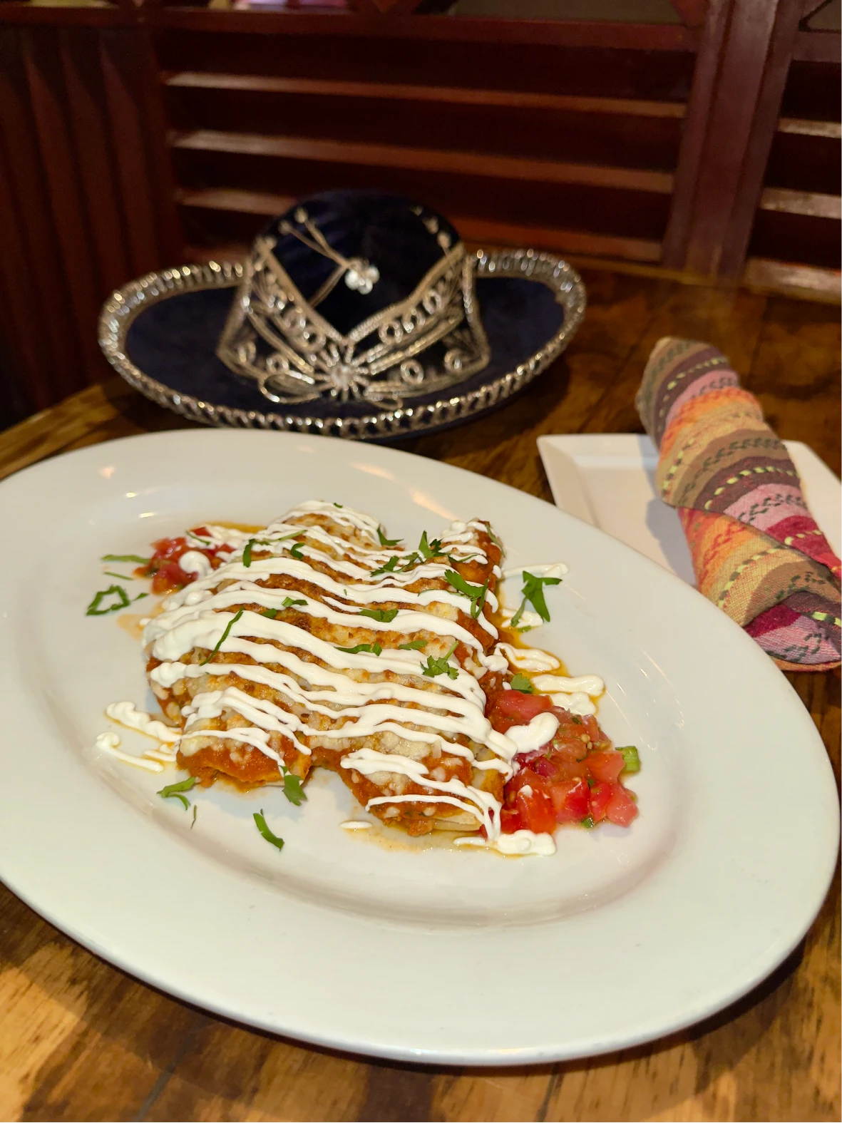 Enchiladas Post date December 3, 2025 Two corn tortillas filled with pulled chicken, pork carnitas or barbacoa (brisket) baked in RANCHERO, TOMATILLO or MOLE sauce with queso fresco & crema. Share: ← Burrito → Sizzling Fajitas